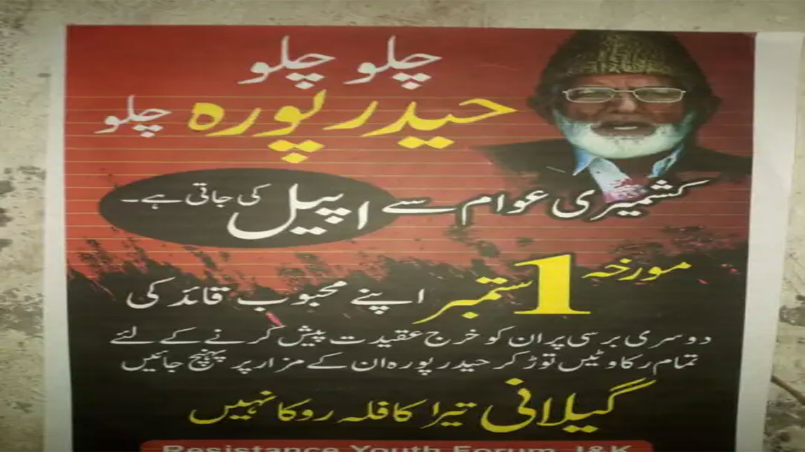 More posters have appeared in different areas of Indian Illegally Occupied Jammu and Kashmir (IIOJK) urging the people to conduct a march towards Hyderpora on Friday to pay tribute to the veteran Kashmiri leader, Syed Ali Gilani, on his 2nd martyrdom anniversary.