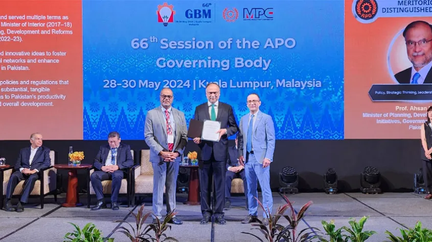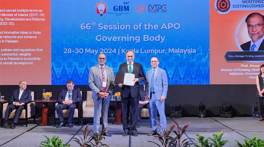 Minister for Planning and Development Ahsan Iqbal received an award from the Asian Productivity Organization in Kuala Lumpur today for his outstanding contribution to socio-economic development efforts through policy, strategic thinking, effective leadership and management.