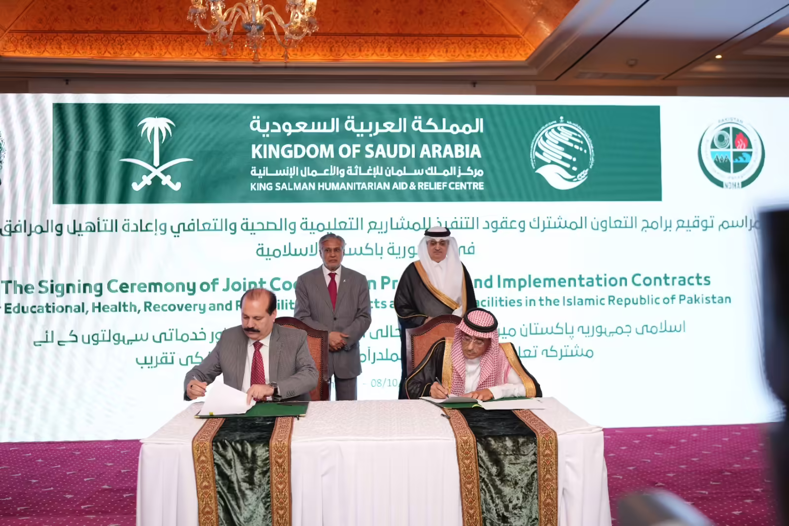 H.E. Engineer Ahmed Ali Al-Baiz, Assistant Supervisor General of Operations at KSrelief, signed 04 different Joint Cooperation Programs (JCP) with the National Disaster Management Authority (NDMA), National Commission for Human Development (NCHD), Pakistan Red Crescent Society (PRCS), and State Earthquake Reconstruction & Rehabilitation Authority (SERRA). Additionally, 08 different contracts for public facilitation projects were formalized. The event was graced by the presence of the Senator Mohammad Ishaq Dar, Deputy Prime Minister and Minister for Foreign Affairs of the Islamic Republic of Pakistan, Saudi Ambassador to Pakistan, His Excellency Mr. Nawaf Bin Said Al-Malki, the representative from NDMA, the Chairman of PRCS, and representatives and country heads from various UN missions in Pakistan.