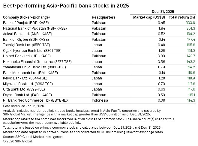 Smaller Pakistani banks delivered some of the highest total returns to investors across the Asia-Pacific region in 2025, buoyed by a strong rally in local equity markets and improving macroeconomic indicators, according to an analysis by S&P Global Market Intelligence.