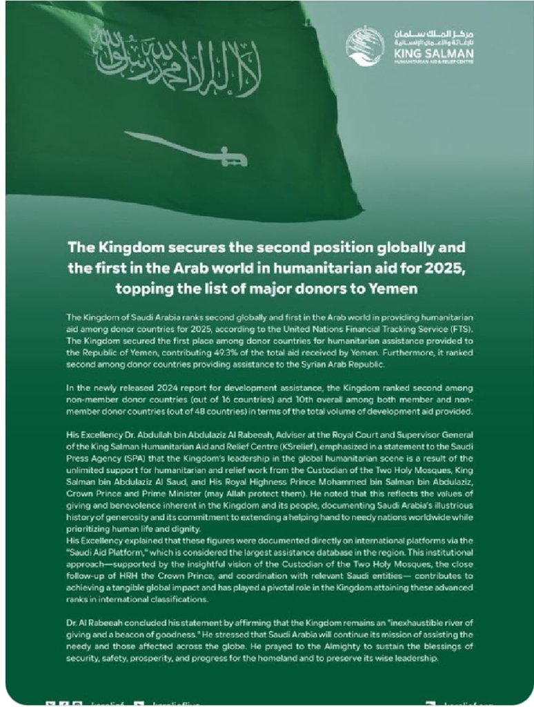The Kingdom of Saudi Arabia ranks second globally and first in the Arab world in providing humanitarian aid among donor countries for 2025, according to the United Nations Financial Tracking Service (FTS). The Kingdom secured the first place among donor countries for humanitarian assistance provided to the Republic of Yemen, contributing 49.3% of the total aid received by Yemen. Furthermore, it ranked second among donor countries providing assistance to the Syrian Arab Republic.