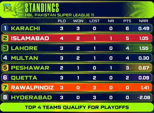 Lahore Qalandars occupy third position with 4 points, followed by Multan Sultans in fourth, also with 4 points but a slightly lower net run rate.